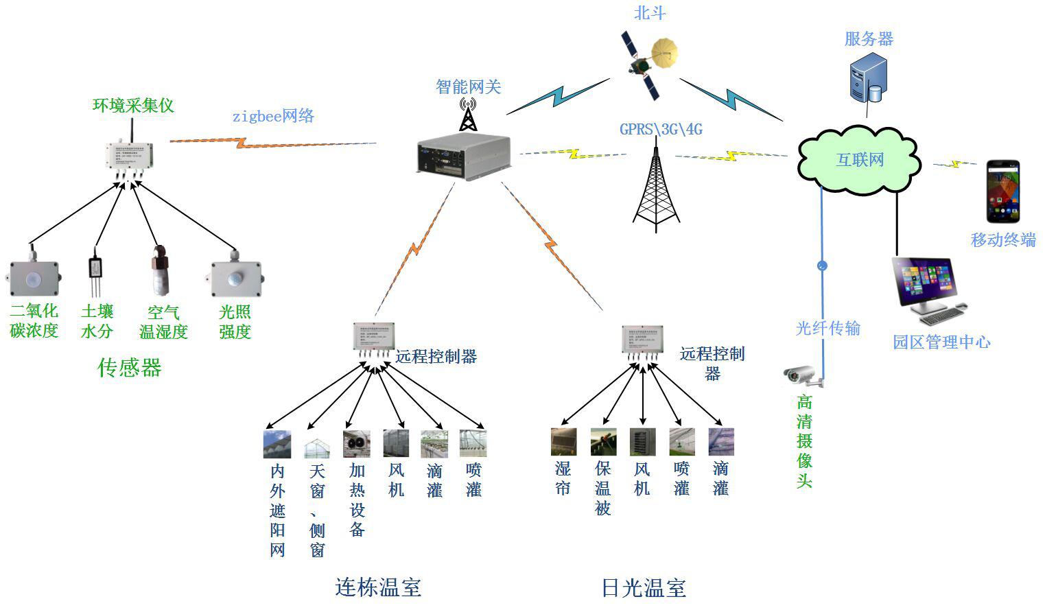 溫室種植的作物多為高附加值產品,需要精細化管理。傳統的人工管理方式不但費時費力,還很難實現精準的控制,而智能溫室管理系統可有效解決這一問題。其核心任務是準確實時地采集溫室的作物生長環境(如空氣溫度、空氣濕度、土壤濕度、光照強度、二氧化碳濃度等),然后根據作物生長需要對農業設施(如風機、濕簾、滴灌、噴灌、天窗等)實現手動或自動控制,從而保證溫室的最佳生長環境,以提高產品的質量和產量。通過攝像頭還可隨時遠程查看現場視頻信號。