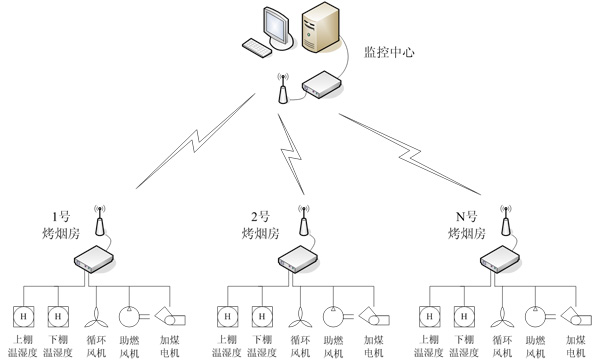 智能烤煙系統由系統管理平臺、通信系統和遠程控制器組成。系統管理平臺存儲和顯示終端數據,可供工作人員查看各烤煙房的運行狀況,并可實現遠程控制和報警功能。通信系統負責監控中心與烤煙房控制終端的組網通信,實現了一機控制多個終端的集中管理模式。遠程控制器負責烤煙房的烤煙過程,可以監測烤房內部的溫濕度或干濕球溫度,通過控制循環風機和冷風門等設備將烤房內的溫度和濕度維持在設定的參數范圍內。